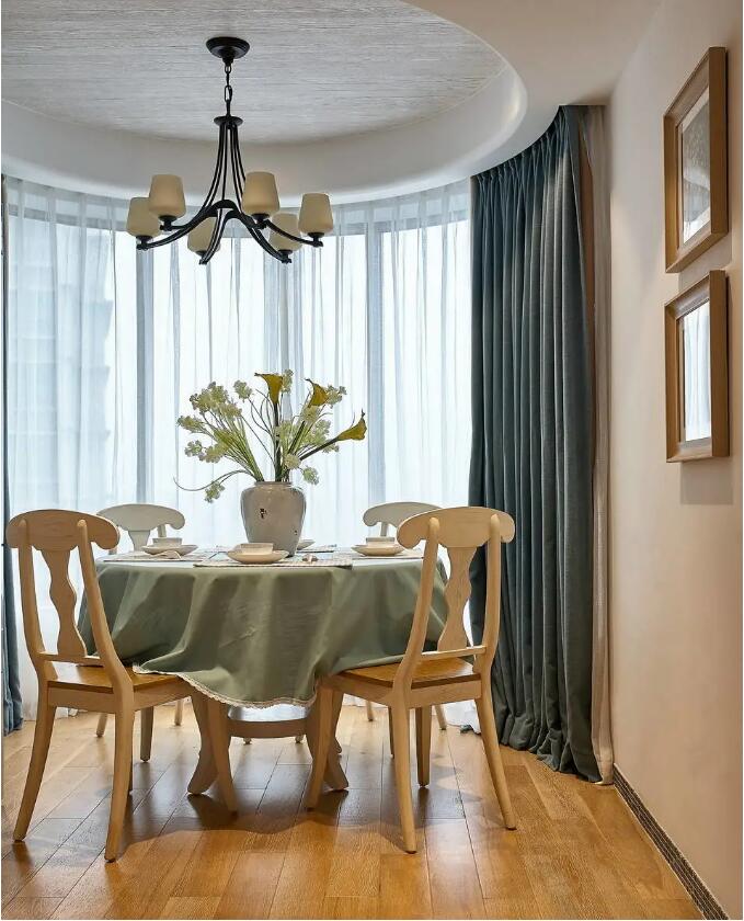 弧形落地窗帶來充足的光線之外,也帶來一絲絲的浪漫氣息,而餐桌上的新鮮花卉的裝飾也體現(xiàn)了業(yè)主家的居家生活更有情調(diào)